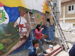 En San Martín Sacatepéquez, adolescentes y jóvenes del grupo LODISAM elaboran un mural para aprevenir la migración irregular