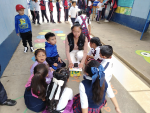 Paralelamente se desarrolló una feria informativa lúdica para que las y los niños de la escuela aprendan y reconozcan los derechos que se colocaron en cada juego que se pintó: La ranita de los derechos, El laberinto de los derechos, El avioncito de los derechos y El gusanito de los derechos, los cuales fueron ubicados en lugares estratégicos del centro educativo. Además, con esta feria informativa también se hizo entrega de 3 guías de los juegos al Director y al personal docente, las cuales les permitirá aprovechar al máximo el potencial de los juegos elaborados.